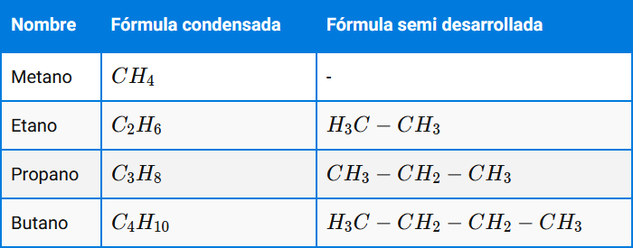 Por ejemplo: Si te piden que escribas la fórmula semidesarrollada de un hexano, ya el nombre te dice que posee 6 C y el sufijo −ano indica que es un alcano, por lo tanto, la fórmula semidesarrollada será: