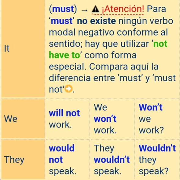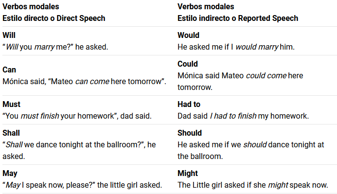Como hemos mencionado arriba, los tiempos verbales cambian una vez que se pasa del estilo directo al indirecto, y los modal verbs tampoco escapan de esto, excepto would, could, should, might y ought to.