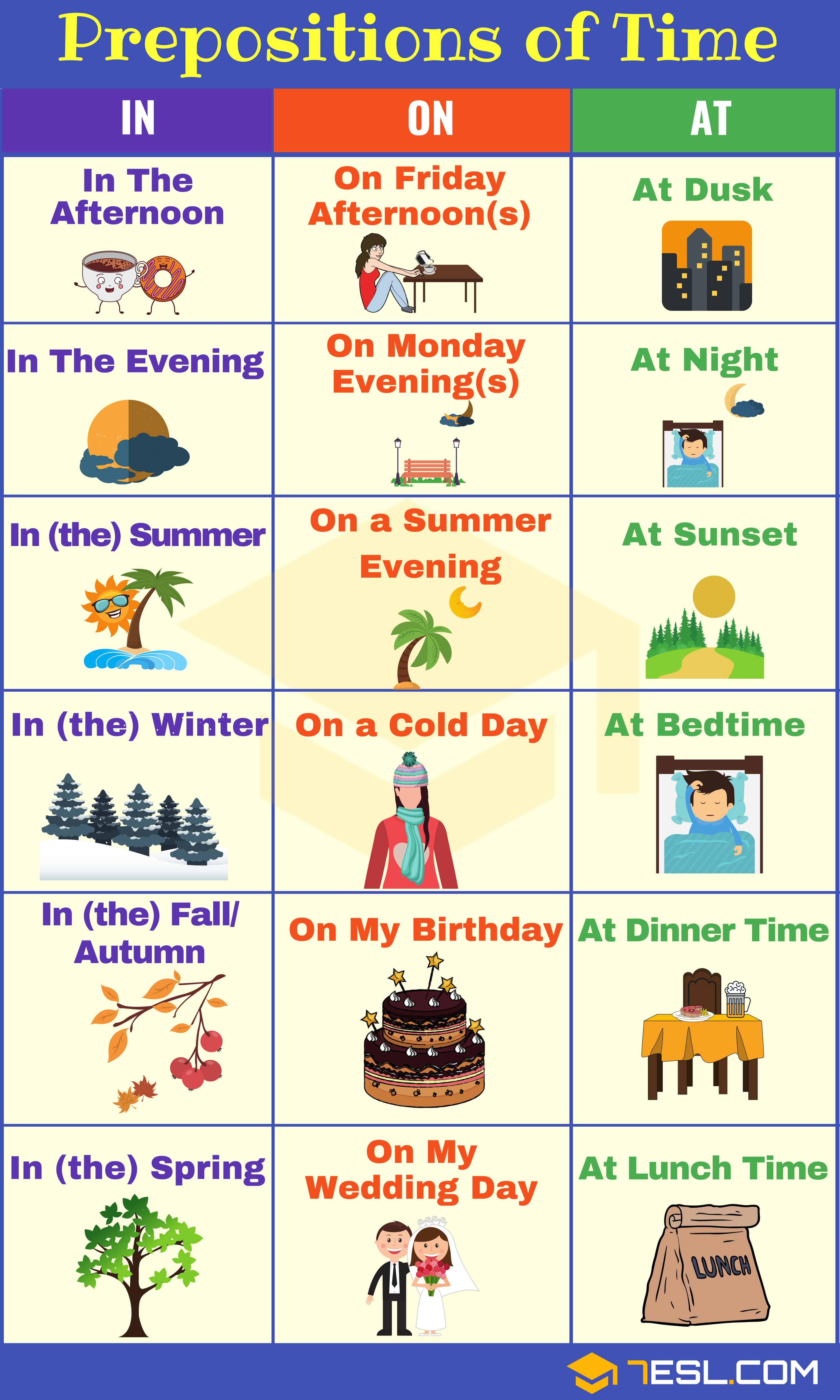 Las preposiciones de tiempo simplemente muestran la relación de tiempo entre dos partes de una oración. Las preposiciones son las palabras que conectan estas ideas al explicar cómo se relacionan entre sí en términos de tiempo. Hay muchos ejemplos diferentes de cómo puede funcionar esto, pero en términos generales, mostrar la relación de tiempo entre dos partes de una oración generalmente se refiere a uno de los siguientes: