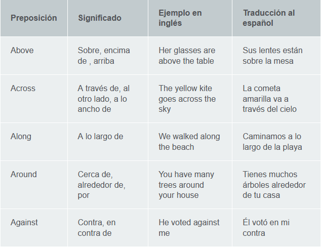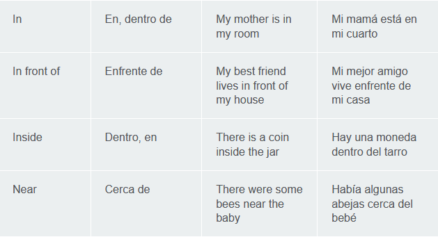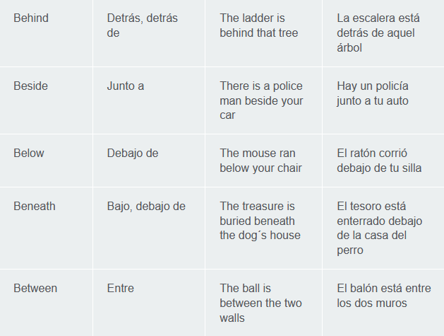 Estos funcionan de manera similar a las preposiciones de tiempo, pero en lugar de mostrar la relación de tiempo, muestran la relación de lugar entre dos partes de una oración. Nuevamente, hay muchas preposiciones que se pueden usar para lugar, pero estas son algunas de las razones por las que podría usarlas: