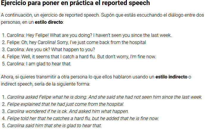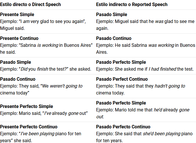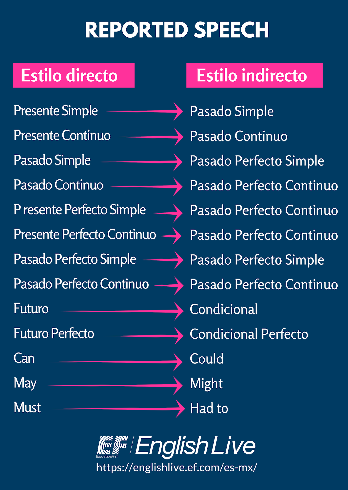 Esas son las reglas que debes tener presente a la hora de cambiar tu estilo directo a uno indirecto. Estos cambios los hacemos diariamente en el español, y el secreto en inglés es la práctica. A continuación puedes encontrar una imagen resumen con todo lo que hemos explicado sobre el Reported Speech: